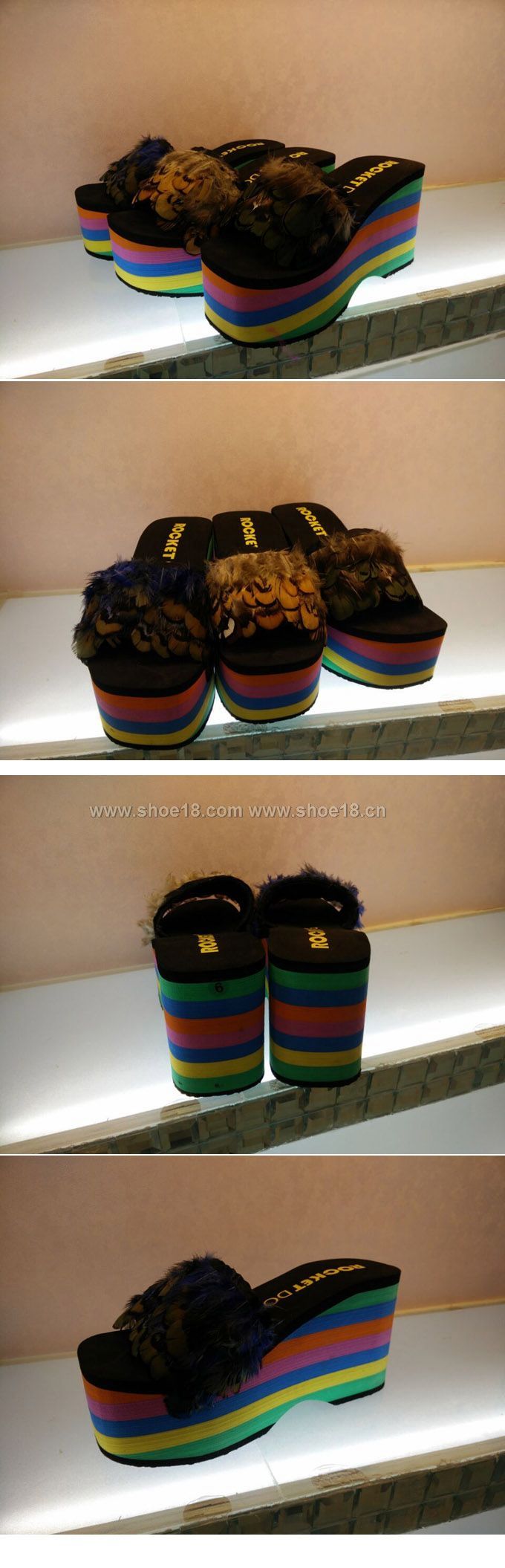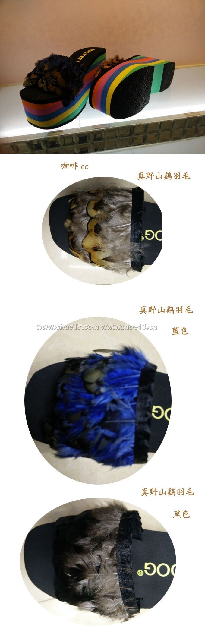 帮面材质: EVA混合材质+野鷄彩色真羽毛+防滑橡膠底