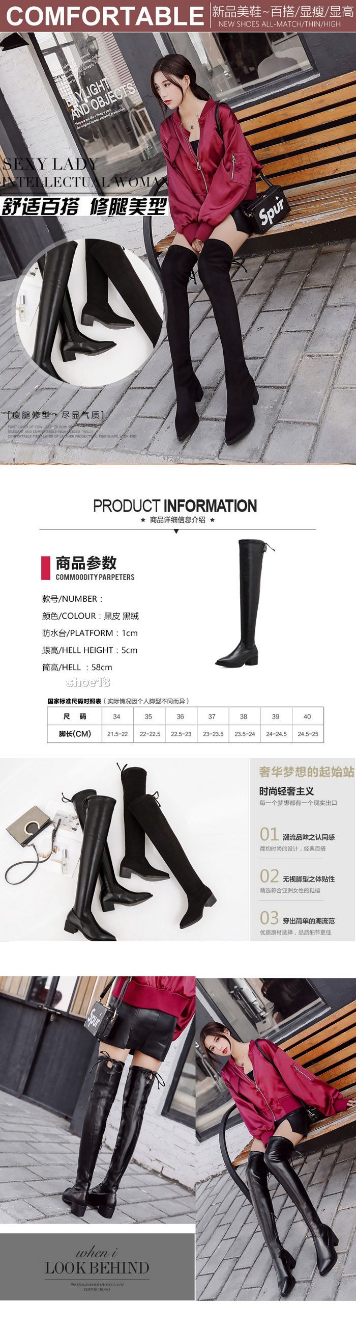此款有 黑色绒面套筒款 黑色皮面套筒款 黑色绒面拉链款 黑色皮面拉链款 尺碼範圍35-40码