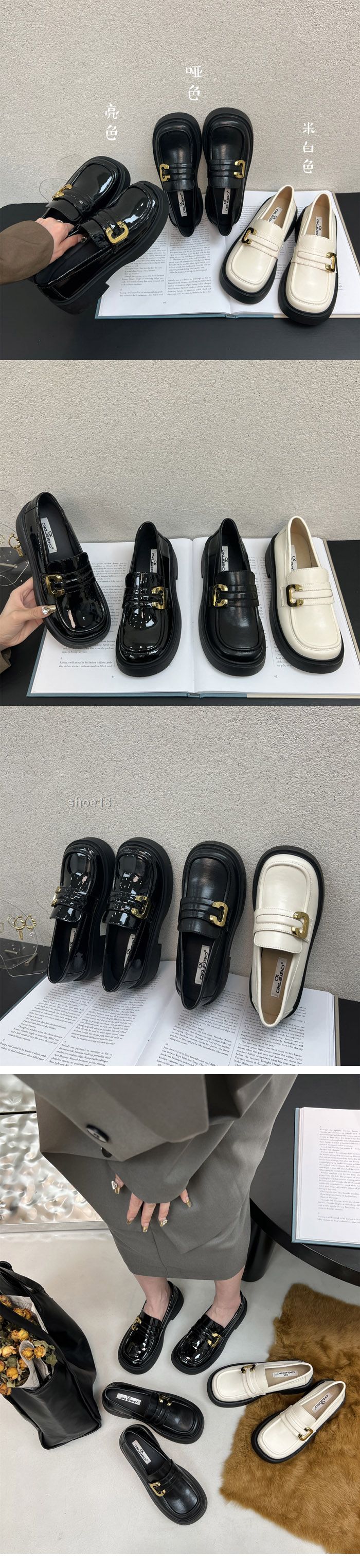此款有 :米白色 哑黑色 亮黑色 尺碼範圍35-39碼