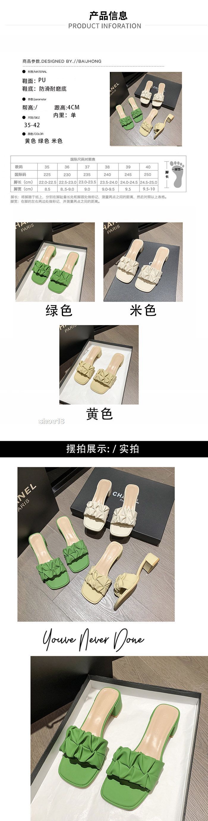 此款有 米白色 黃色 緑色 尺碼範圍35-42碼